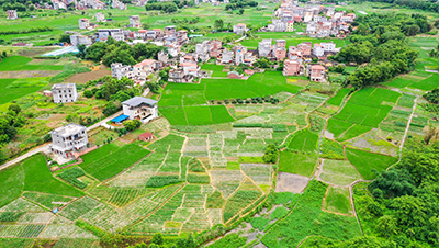 俯瞰广西梧州市苍梧县沙头镇龙科村,青绿色的田园生机盎然。