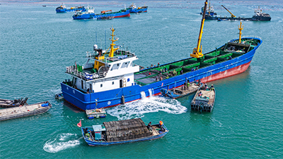 在山东省荣成市爱伦湾鲍鱼港,养殖工人从来自福建海域的运输船上卸下“越冬”归来的鲍鱼,转运至养殖海区继续养殖。